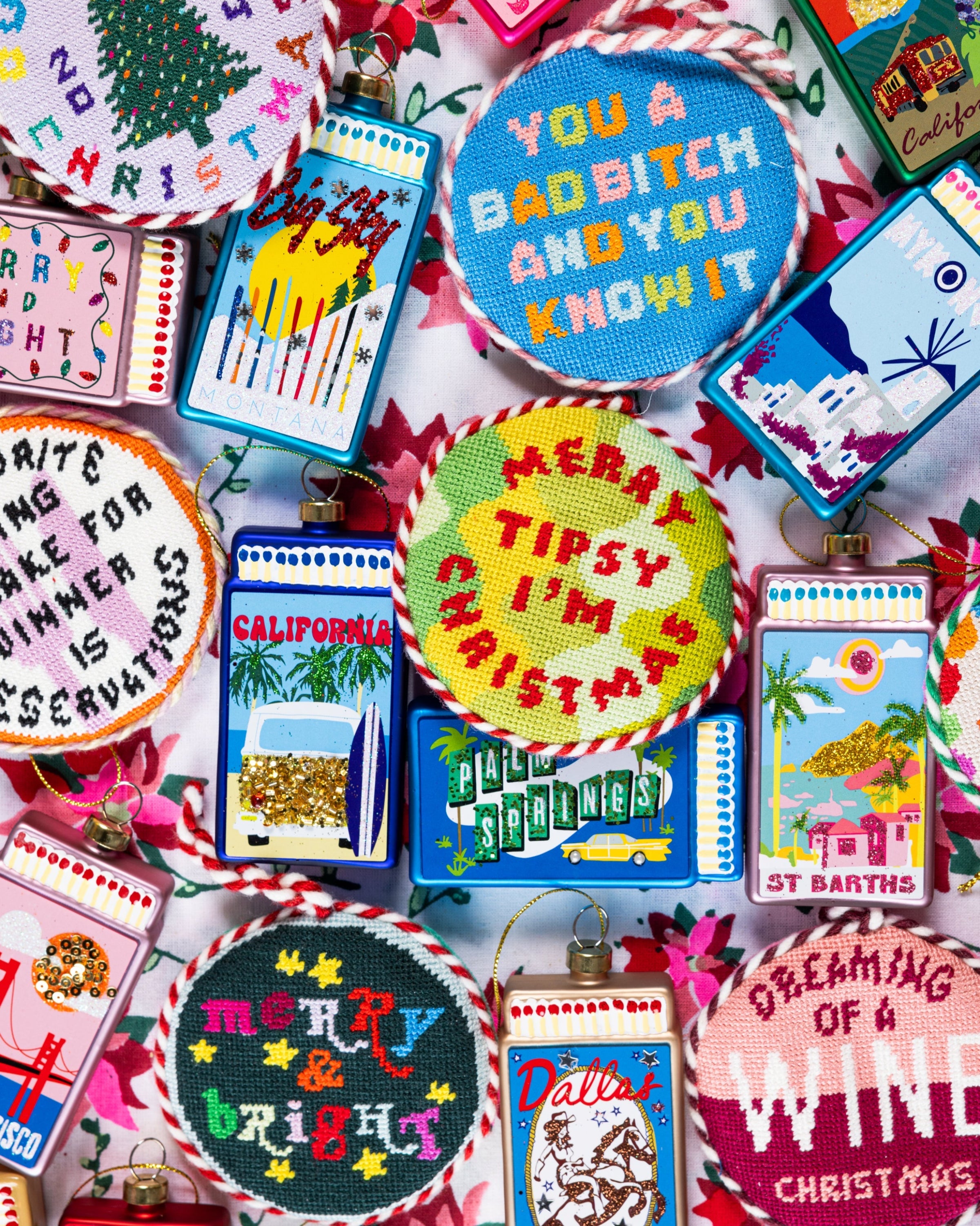 Take your holiday decor from trad to rad with Furbish's curated assortment of festive AF needlepoint pillows, ornaments, tree toppers, stockings, and tree skirts.