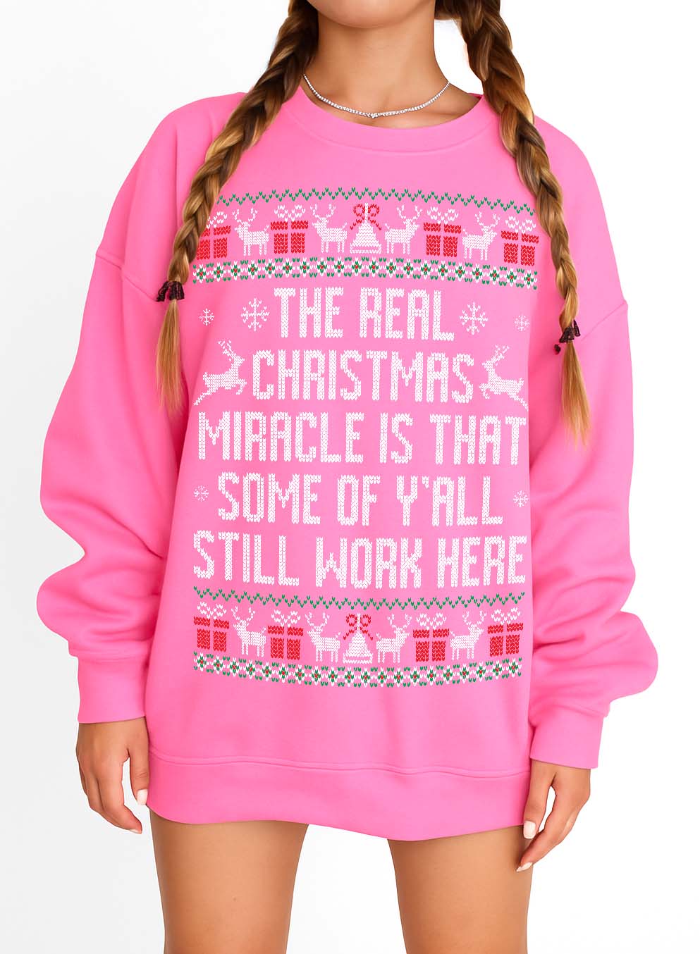 Miracles come in many forms — like showing up to work on time or surviving another all-hands meeting. The Real Christmas Miracle ugly Christmas sweater is a festive tribute to every overworked employee, chaotic coworker, and manager just trying to hold it together until PTO kicks in.