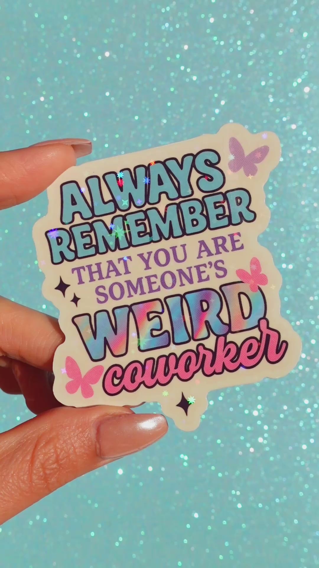 Office life reminder: no matter how normal you think you are, you’re definitely someone’s weird coworker. This holographic vinyl sticker brings the laughs with bold lettering, butterflies, and sparkling rainbow shine. Perfect for decorating your work gear or gifting to your favorite office oddball.