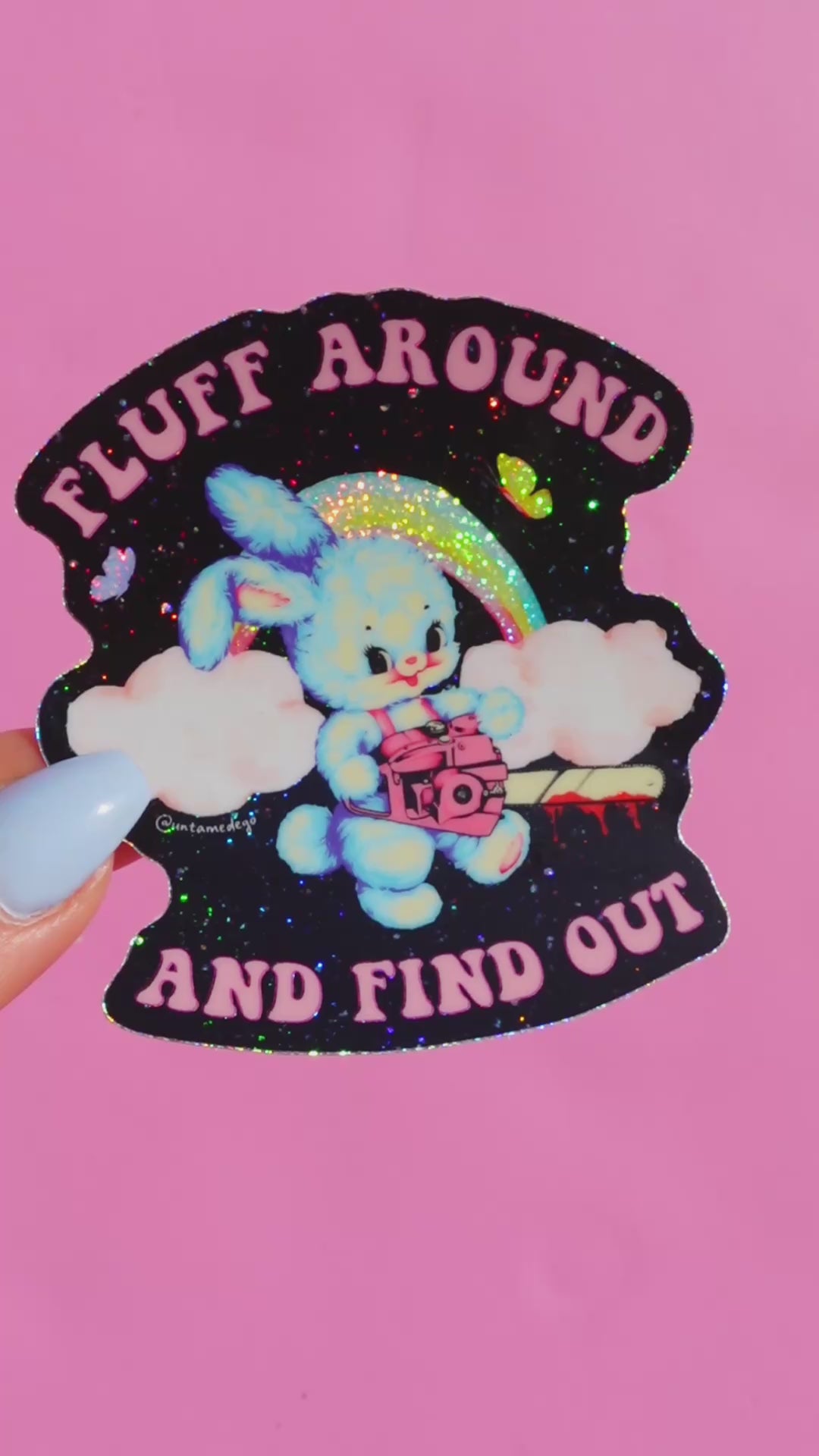 Original design by Untamedego. Sweet but savage — our Fluff Around and Find Out sticker features a pastel retro bunny holding a pink chainsaw under a glitter rainbow sky. Durable, waterproof, and UV-protected design, this sticker will maintain its vibrant colors and glittery finish, no matter the weather conditions. Perfectly sized at 3x3 inches, it's suitable for indoor and outdoor use, ensuring you can showcase your unapologetic attitude wherever you go.