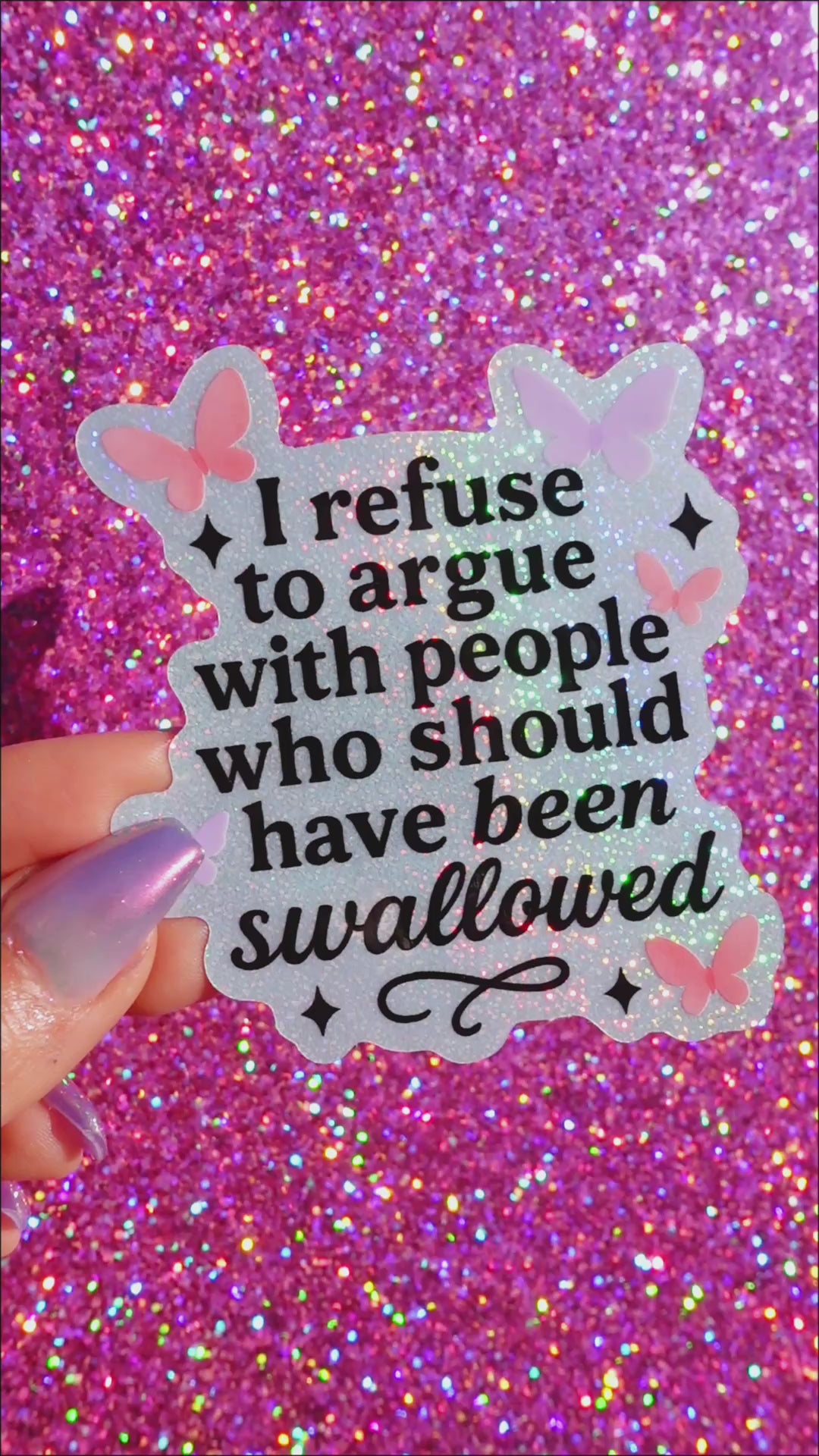 This glitter vinyl sticker says what everyone else is too polite to: “I refuse to argue with people who should have been swallowed.” Decorated with pastel butterflies and shimmering sparkles, it’s the perfect blend of sweet and unhinged — exactly the kind of chaos energy your laptop or water bottle deserves.