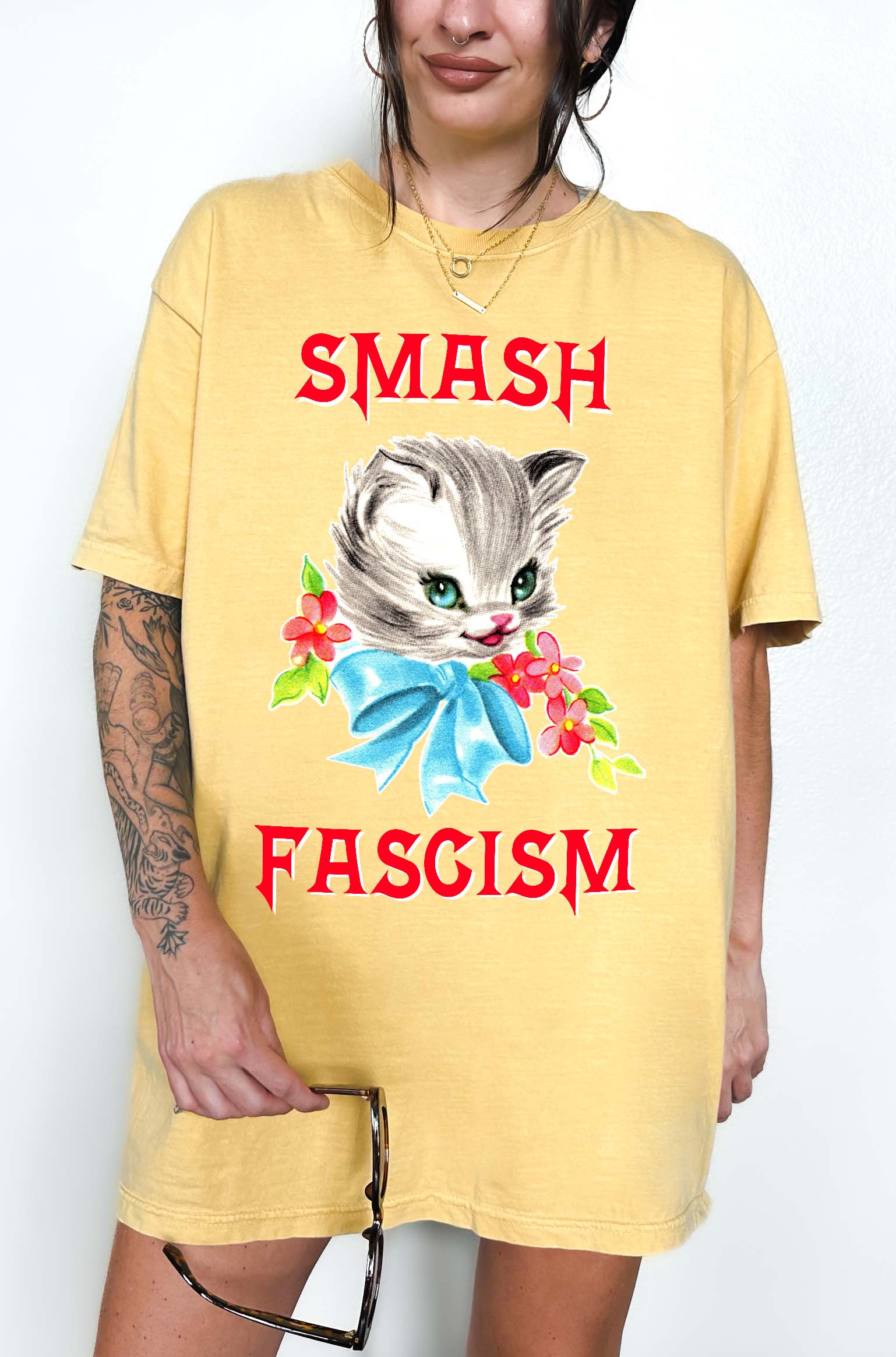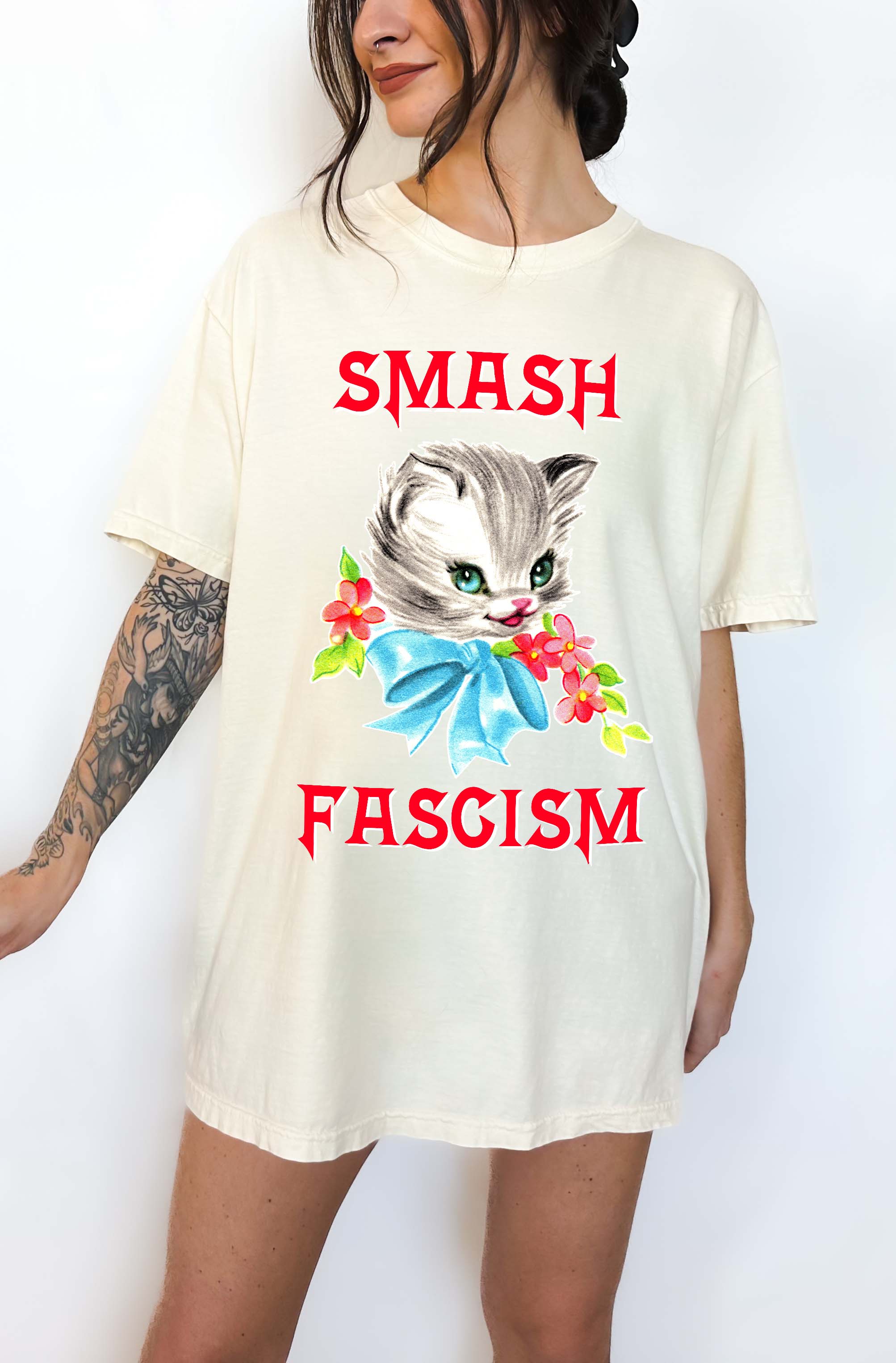 • Bold vintage-style “Smash Fascism” text