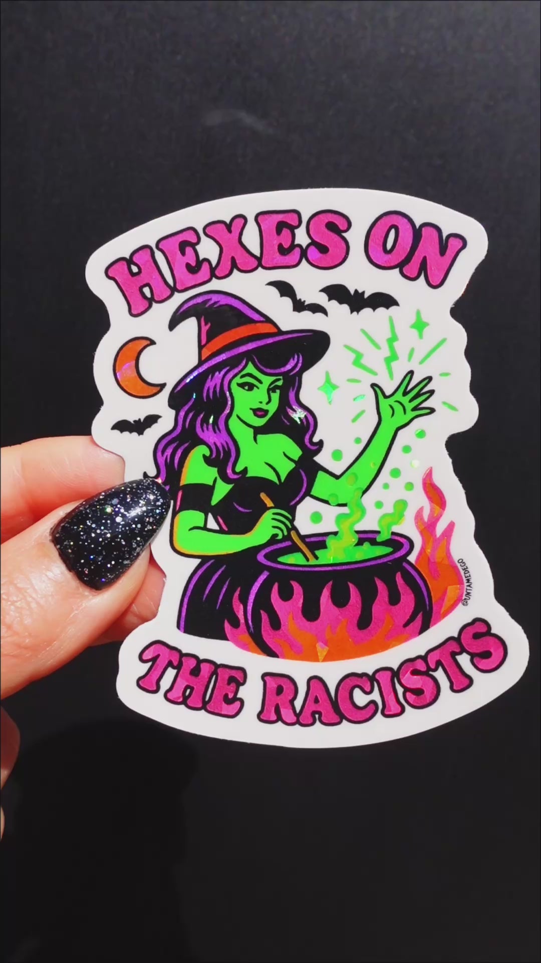 This vinyl sticker features a neon green witch stirring her bubbling cauldron, casting spells with the unapologetic phrase: “Hexes on the Racists.” Complete with bats, flames, and retro Halloween vibes, it’s spooky, powerful, and just the right mix of cute and confrontational.