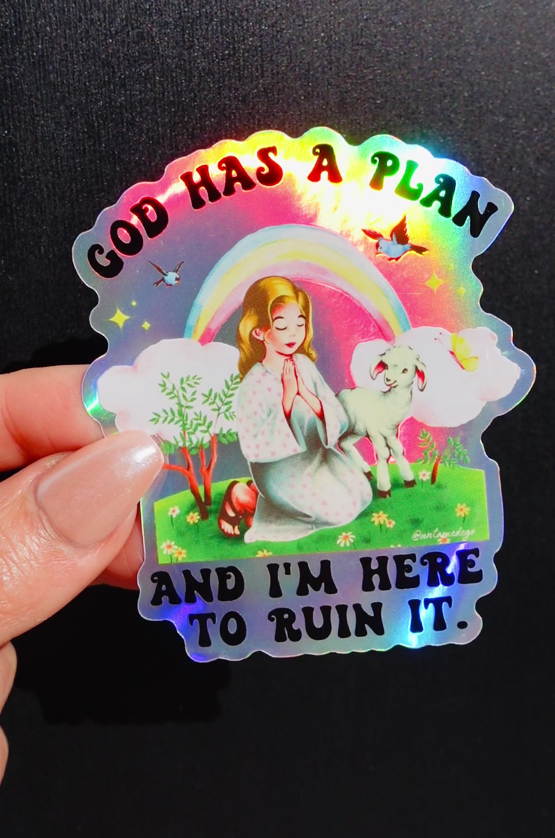 Sweetly subversive with a sparkle. This holographic vinyl sticker features retro artwork of a girl praying with a lamb under a rainbow, paired with the bold phrase: “God Has a Plan and I’m Here to Ruin It.” A perfect mix of kitsch, humor, and rebellion—ideal for sticker collectors and fans of sarcastic retro vibes.