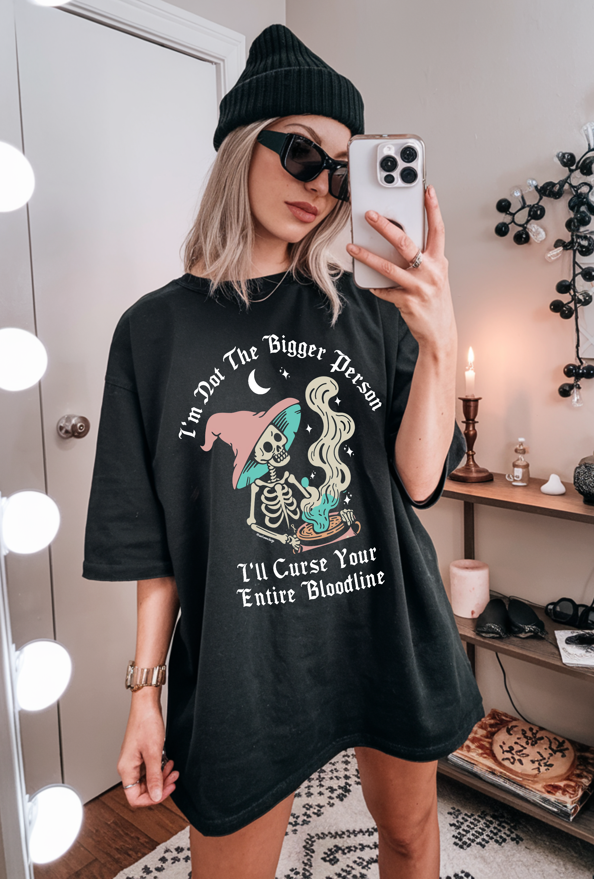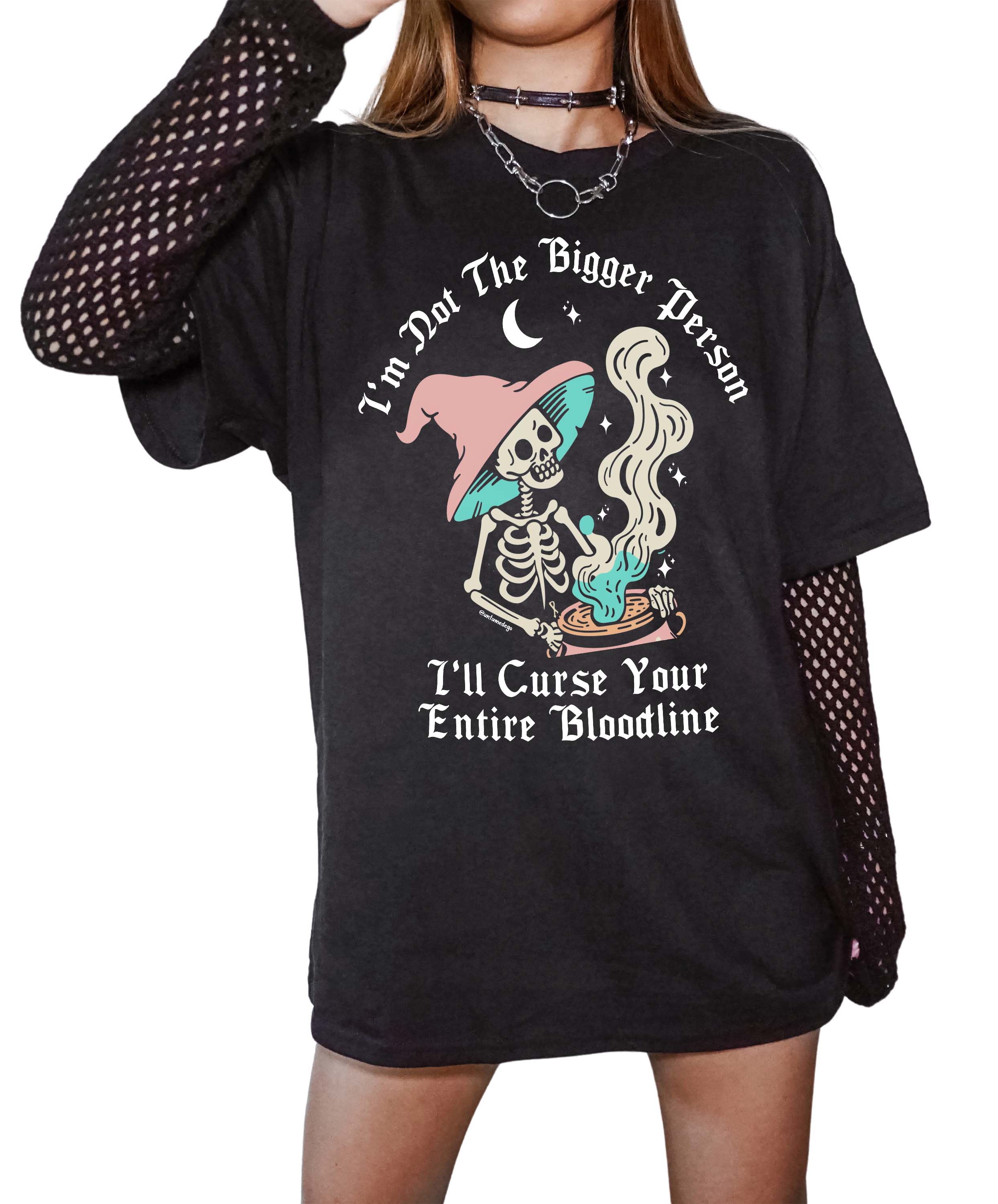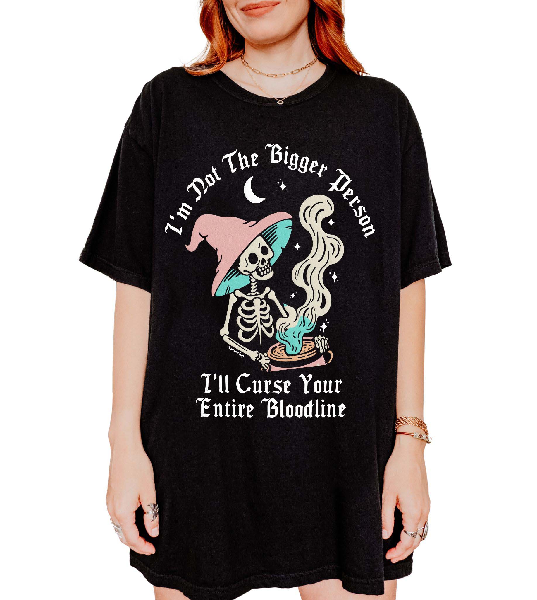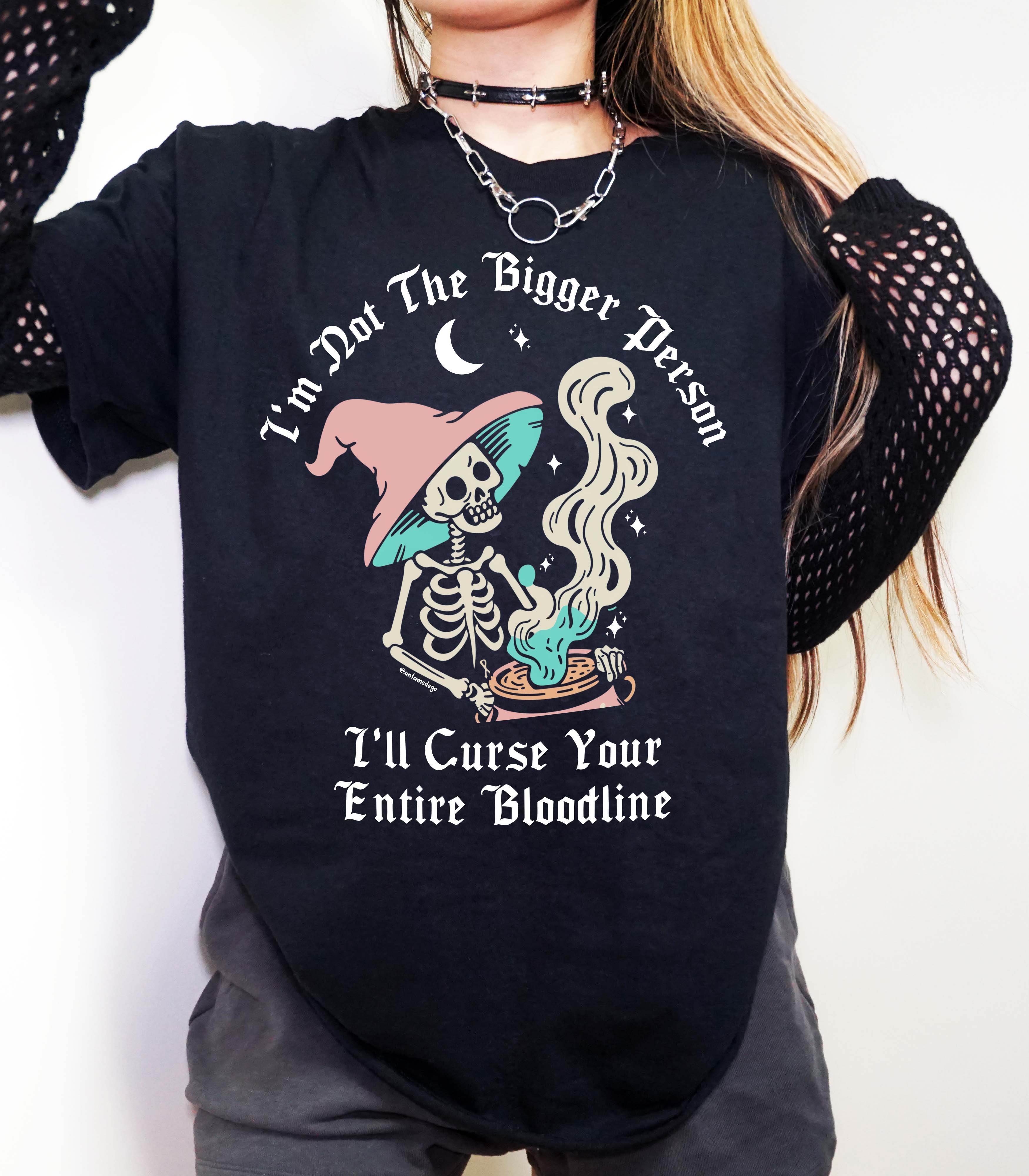 Are you tired of biting your tongue and playing nice? Meet your new favorite tee! The I'm Not The Bigger Person, I'll Curse Your Entire Bloodline T-shirt is for those who prefer hexes over hugs. Crafted from ultra-soft, curse-compatible cotton, this shirt screams, No more Mrs. Nice Witch. Perfect for the sarcastic souls and unapologetic personalities, it's your wardrobe's new secret weapon. Slip it on, cast a stylish spell, and let the world know you mean mischievous business. 🖤