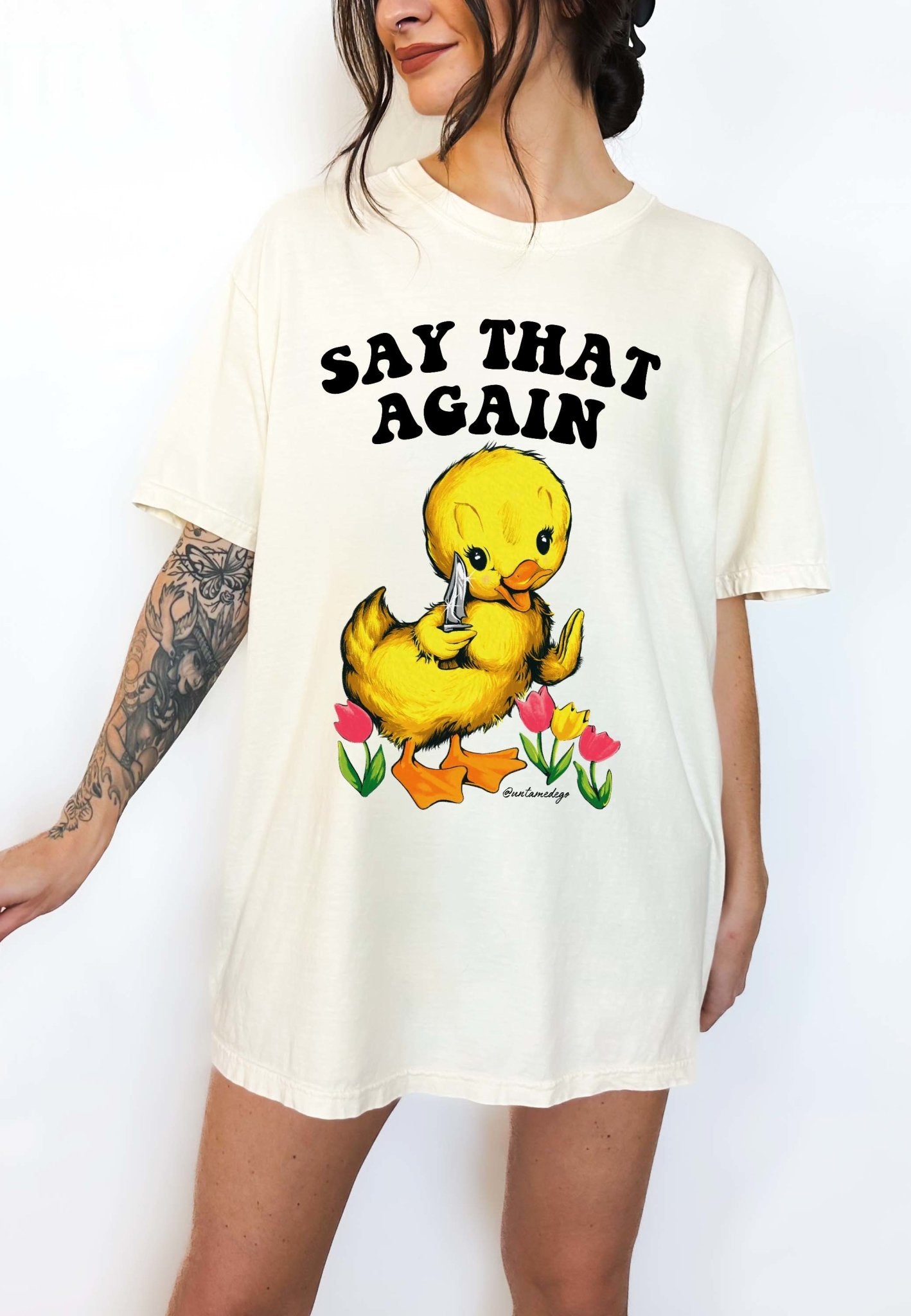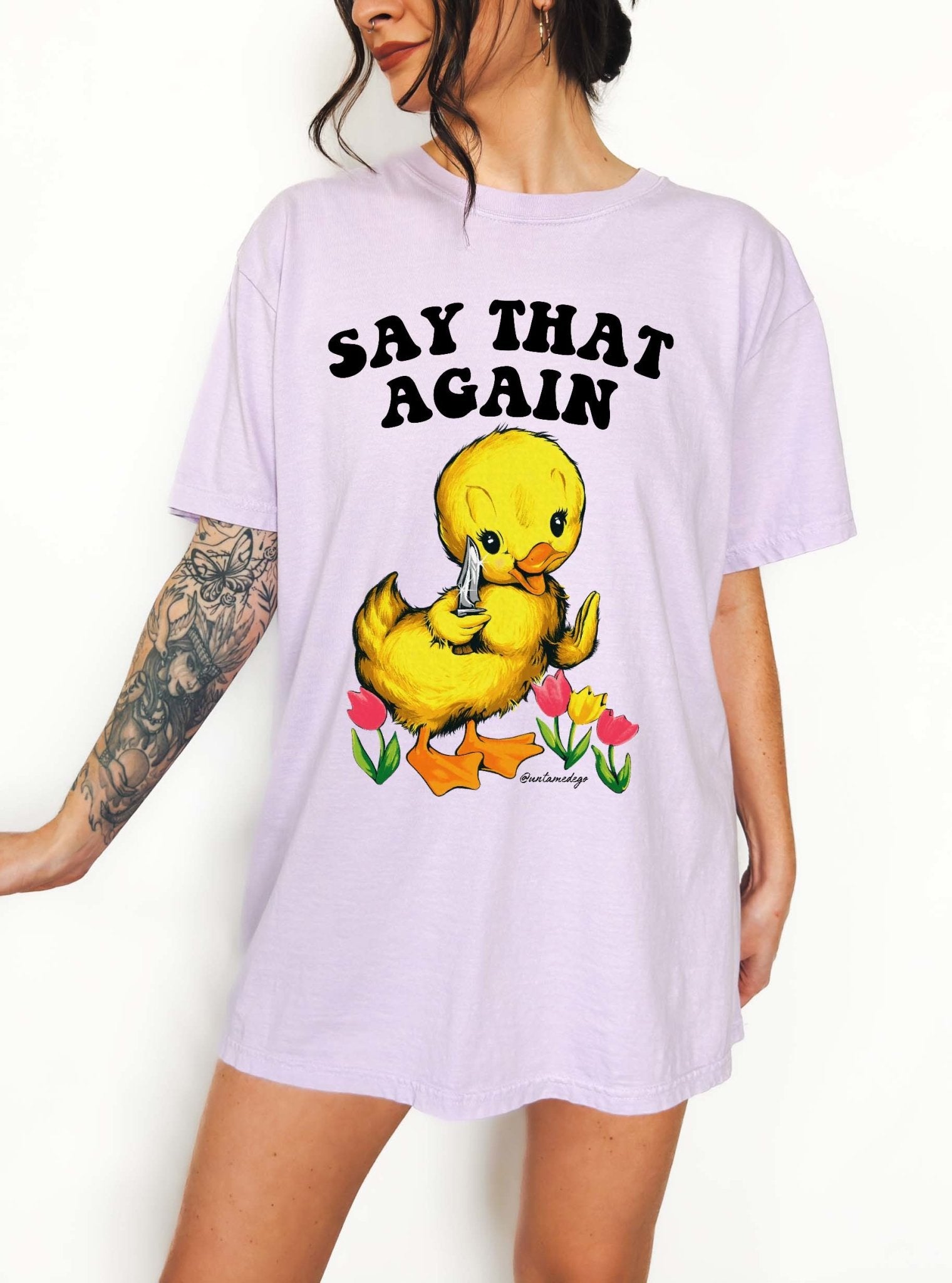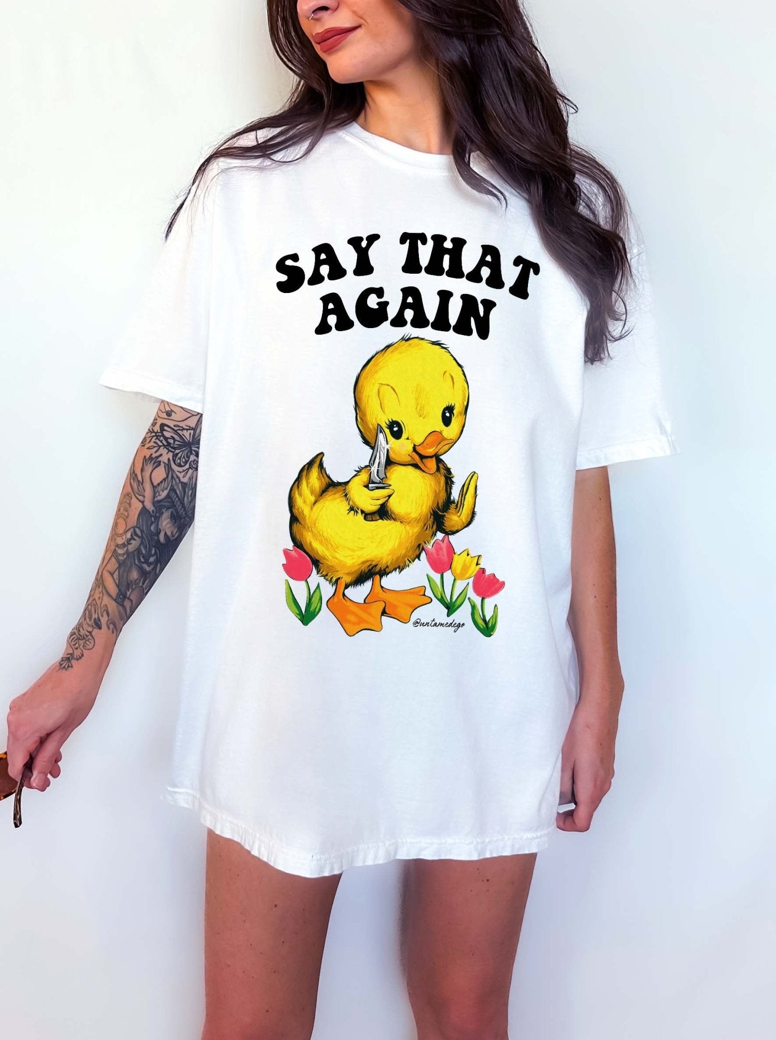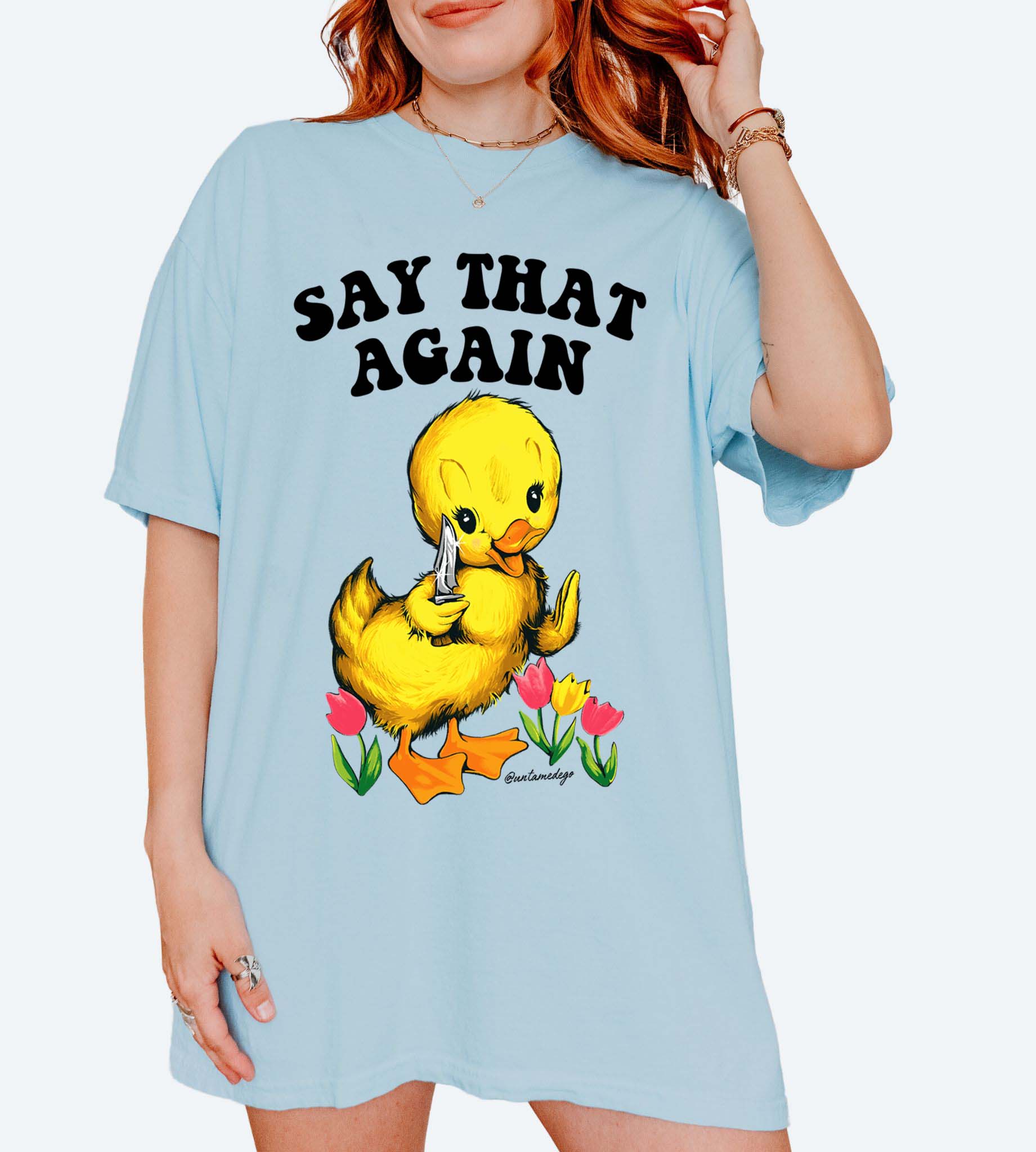 This Funny Angry Duck Shirt features a retro-style duck with a knife and the phrase “Say That Again” — perfect for fans of sarcastic humor, animal memes, and oversized comfort.
