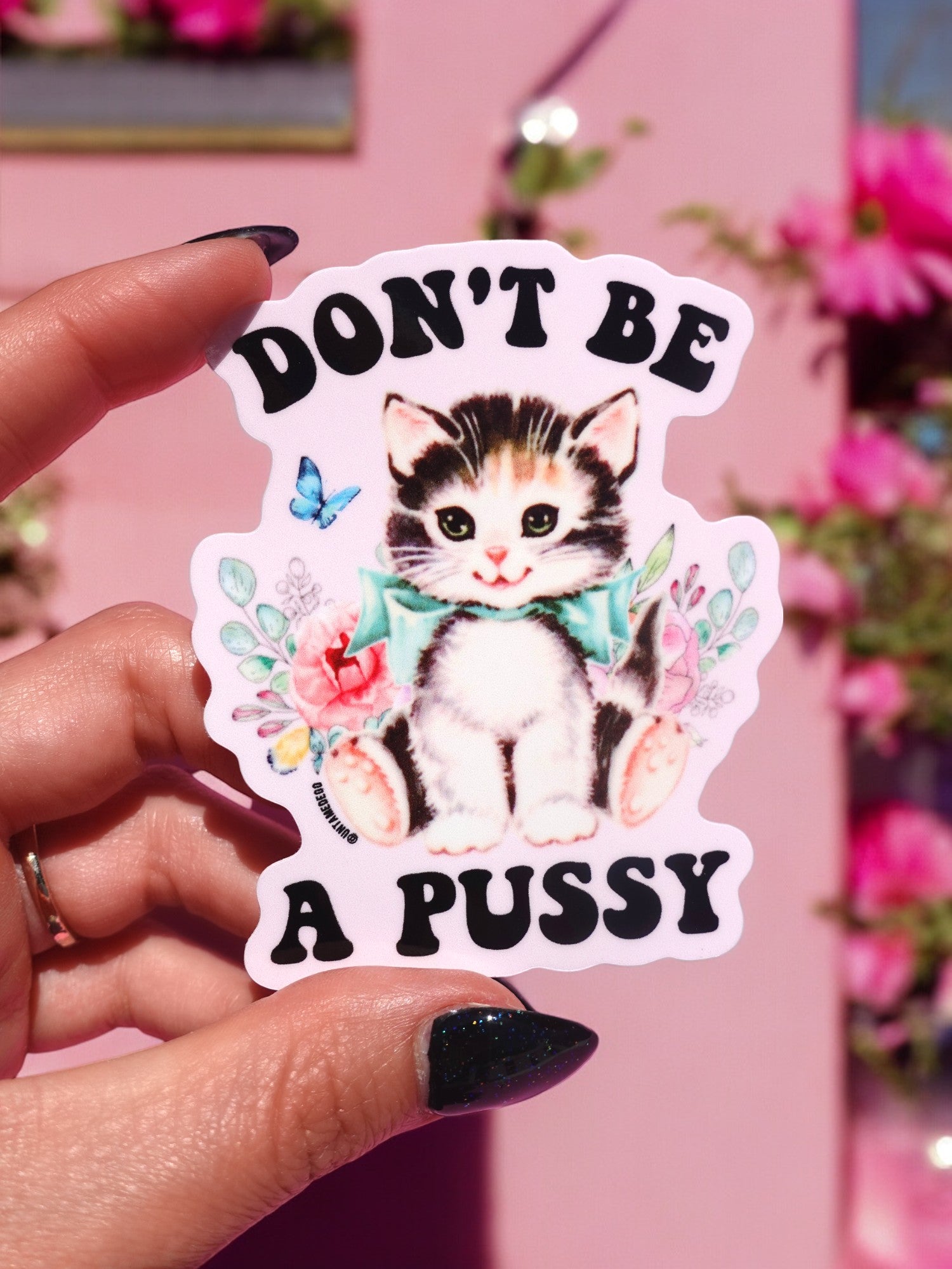 Cute, retro, and sarcastic. This glitter vinyl sticker features a vintage-inspired kitten with a bow and flowers alongside the bold phrase “Don’t Be a Pussy.” Sparkly and cheeky, it’s a statement piece that blends kitsch with modern humor — perfect for laptops, journals, or water bottles.
