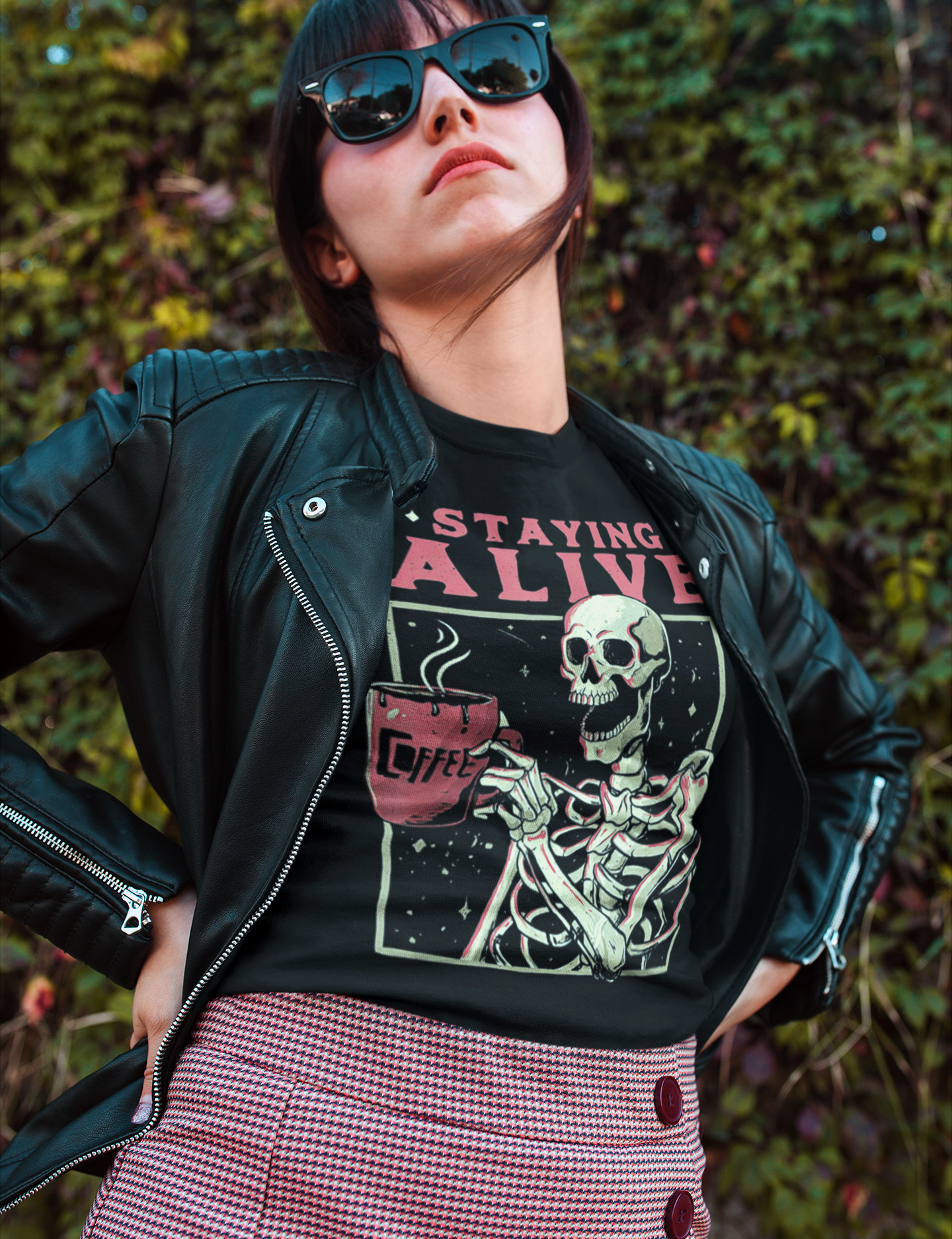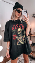 Get your spook on with our Skeleton Drinking Coffee Staying Alive Tee! Perfect for coffee-loving ghouls, this shirt is as sassy as it is comfy. Join the caffeinated undead community and make every sip a scream!